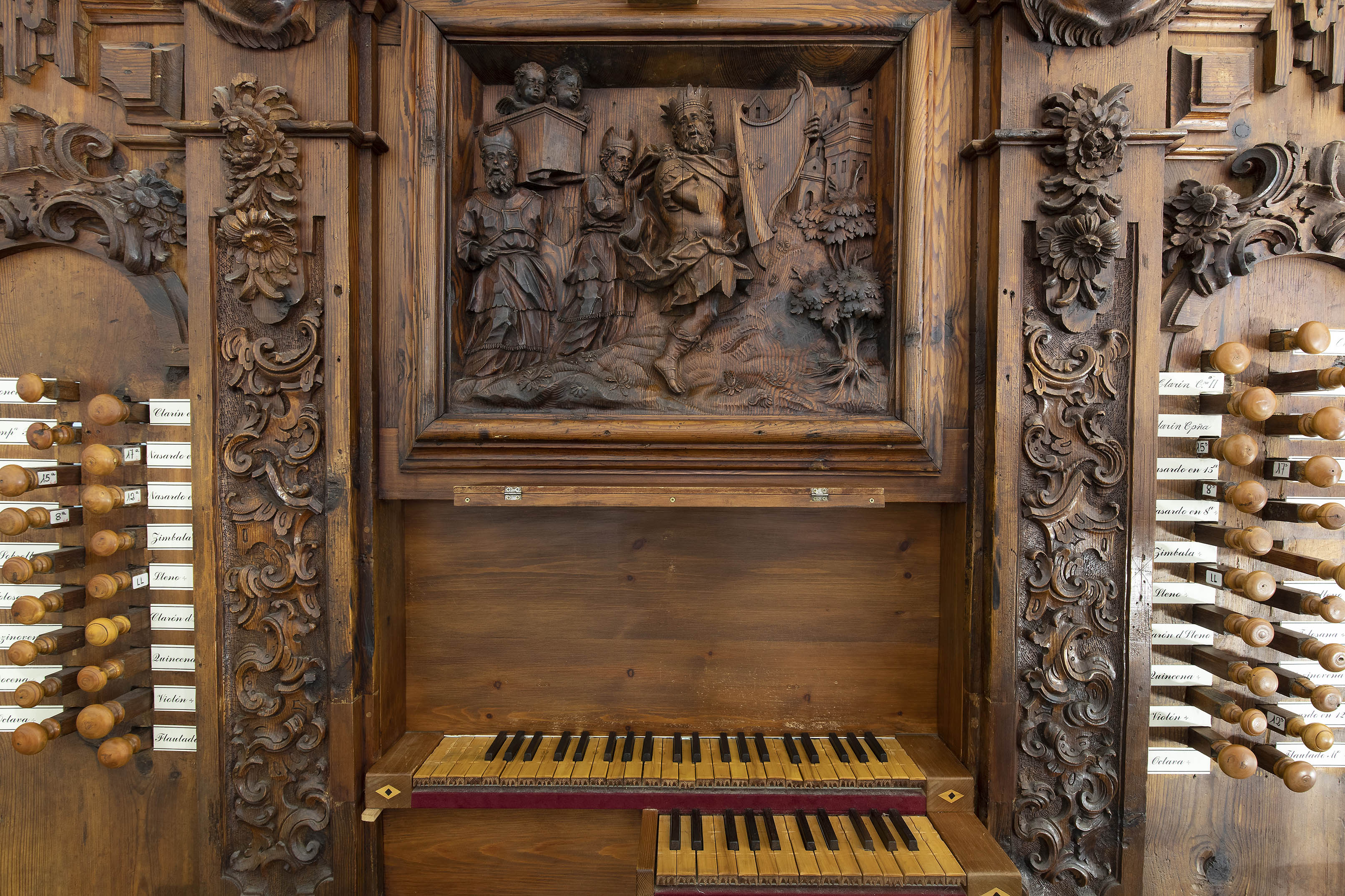 A los pies de la nave central se sitúa el coro alto, sobre arco rebajado.