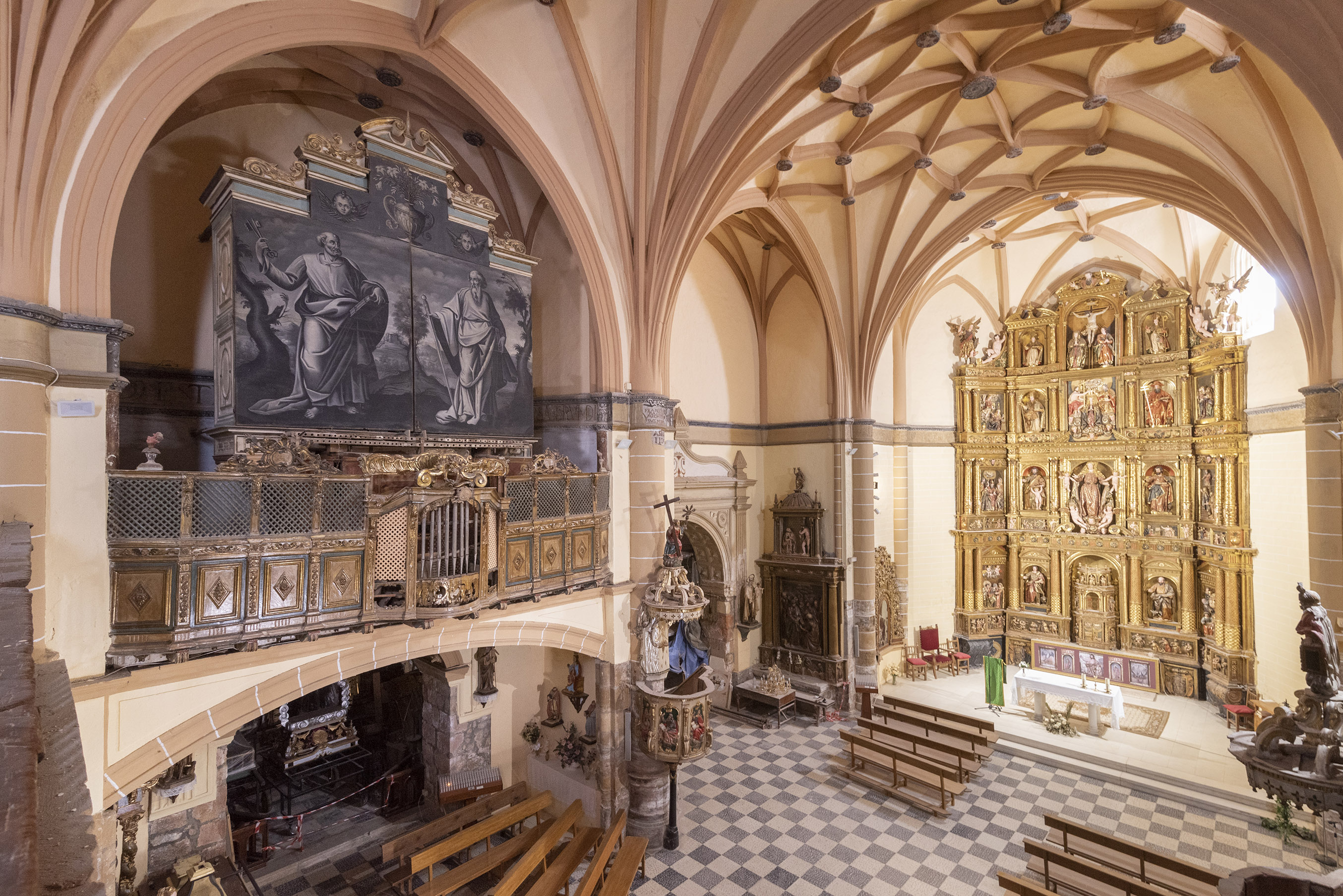 Normal 0 21 MicrosoftInternetExplorer4 Es una iglesia que presenta cabecera plana, crucero no acusado en planta con una capilla abierta en su lado septentrional y tres naves (la central más ancha que las laterales) de tres tramos cada una. El sistema de cubrición empleado es el siguiente: la cabecera se cubre con bóveda vaída con linterna, el crucero lo hace con cúpula de media naranja sobre pechinas y linterna, y las naves van cubiertas por bóvedas de medio cañón con lunetos, excepto el tramo de los pies de la nave central que lo hace con bóveda conchiforme, igual que los brazos del crucero; la capilla adosada al brazo izquierdo del crucero va cubierta por una cúpula elíptica con linterna. Destaca la decoración pictórica interior del templo, especialmente las figuras de los cuatro Evangelistas representados en las pechinas de la cúpula del crucero; también sobresale el entablamento barroco que rodea la totalidad de la nave, así como la decoración figurada de las ventanas, alojadas bajo los lunetos de las bóvedas. La interesante decoración de la carpintería (puerta de acceso, entablamento del coro y puerta de la sacristía) repite elementos vegetales de las yeserías de las naves laterales. Estos elementos también aparecen en las metopas del friso de la portada de piedra al exterior, dando en definitiva una impresión de unidad al conjunto ornamental. Al exterior destaca, en el lado de la Epístola, el pórtico de acceso formado por tres esbeltos arcos de medio punto sobre pilares; este pórtico aloja en su interior la portada adintelada de piedra: de orden clásico con una hornacina avenerada y rematada por un frontón curvo partido. La torre campanario, adosada a los pies, en el lado de la Epístola, y construida con sillería, presenta tres cuerpos en altura separados por una imposta barroca. El último cuerpo muestra cuatro grandes vanos de medio punto para campanas y es rematado con un chapitel de piedra.